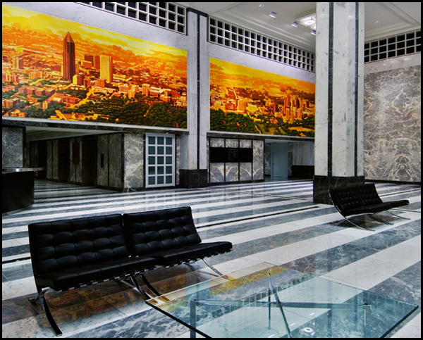Ideal for Corporate entertaining, 270 Peachtree's new $1 Million plus Lobby Renovation celebrates Downtown's evolution as THE Central Business District of Metro Atlanta with a permanent triptych mural spanning the territory from Buckhead to the new Underground. Painted by New Orleans artist Alexander Stolin, the mural's vibrant golden colors depict Downtown Atlanta's exciting 21st Century rebirth.